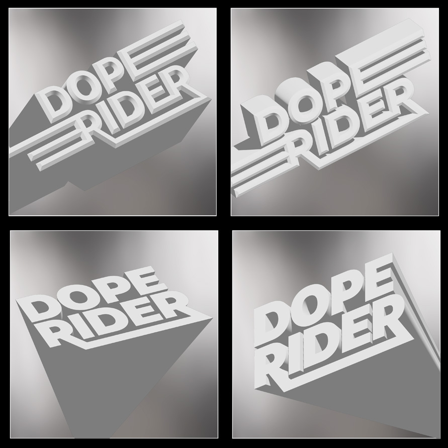 We also wanted to utilise the ‘The Utopia Strong’ logo on the back of the sleeve and in the same style as the front ‘Doperider’ logo font, which also needed to be rendered in 3D. So, I followed the same process taking it into Dimensions and playing around with the light, angles and surface materials.